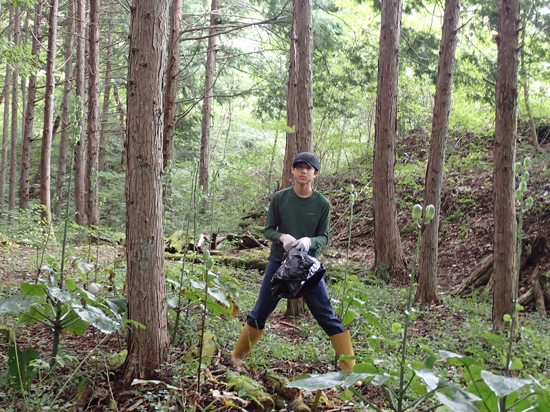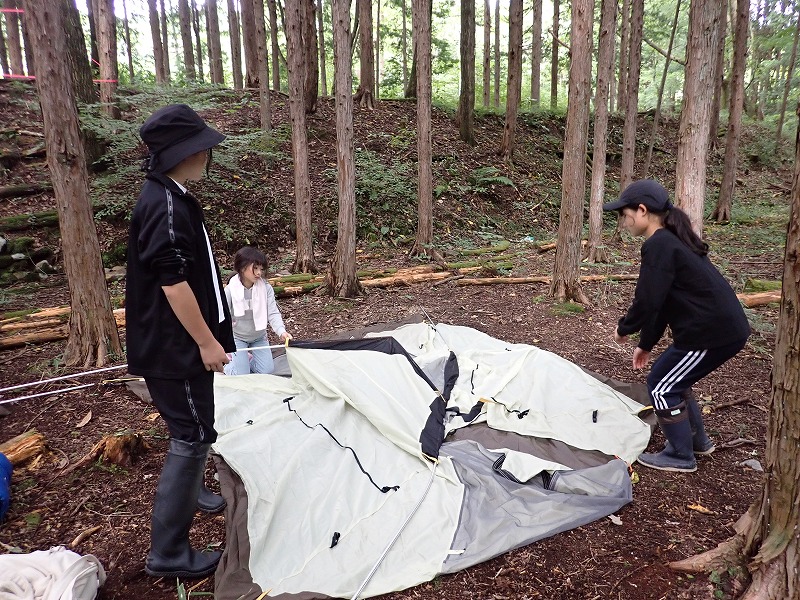 注意事項等を聞いた後、早速キャンプ開始!これ以降はセンターの建物内に立ち入らないことを約束してから、外に出て、林の中にテントを張ったり野外トイレを作ったりしました。