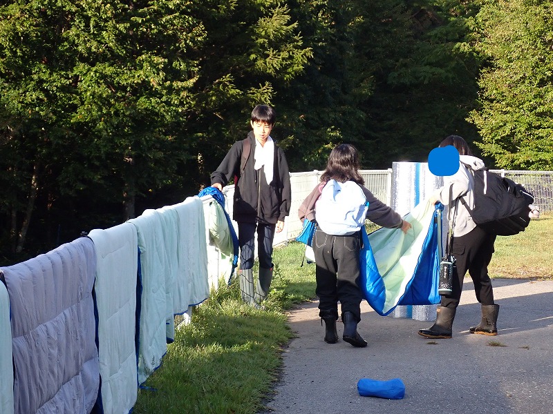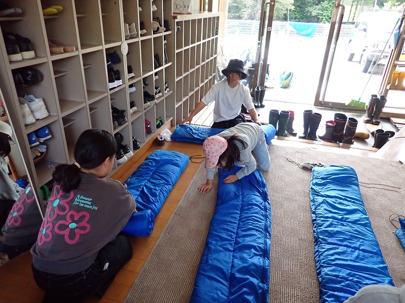 そして、干していたテントをみんなで協力してたたみ、苦手意識を持つ子が多い、寝袋たたみもしました。テントも寝袋も空気を抜いてコンパクトにたたむことが大事なので、テントや寝袋に寝そべり、空気を抜いていた子がいました。