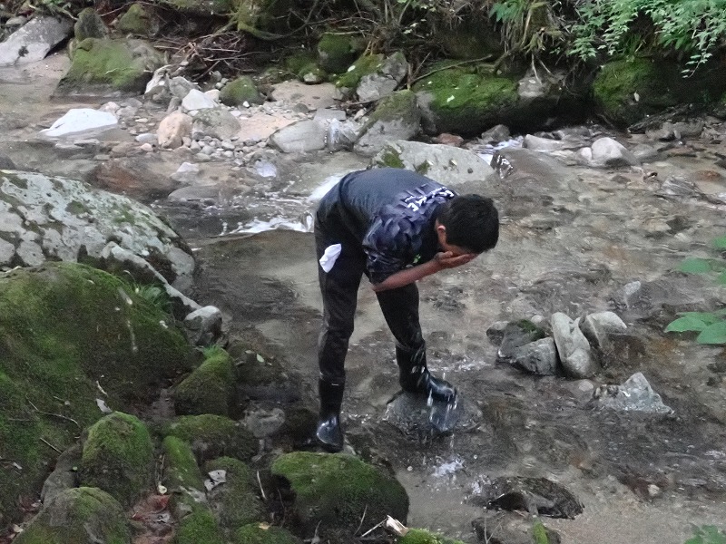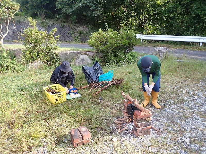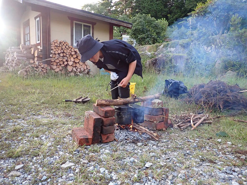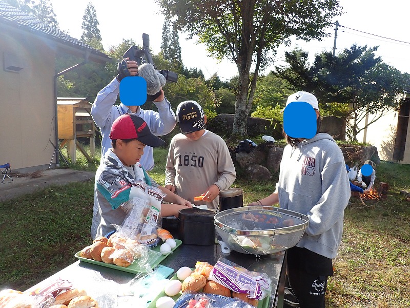 6時半に起床した後は、川で顔を洗い、テントや寝袋をセンター敷地のフェンスに干してから、朝ご飯作りに取り掛かりました。21日の夕食に続き、朝ご飯も順調に作り始めた子どもたち。コンソメスープに入れる冬瓜を見て「どうやって切るの?」「どうやって皮を剥くの?」など、困惑する子がいたり、焚き付けの新聞紙の置き方が悪くてマッチを無駄に消費した班があったりしましたが、どの班も予定時刻以内に朝食を食べ終え、片づけをすることができました。