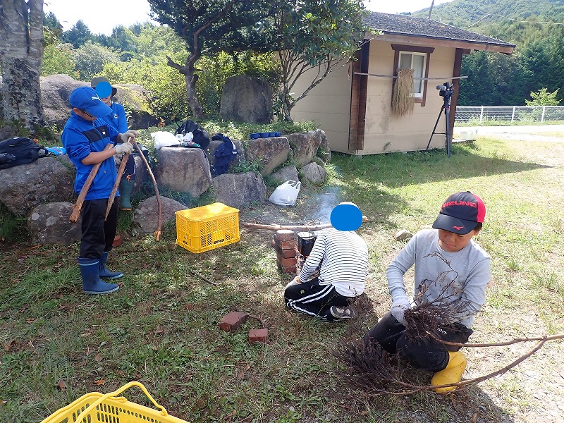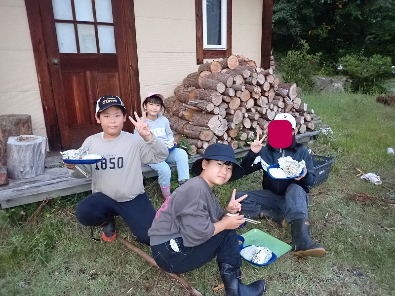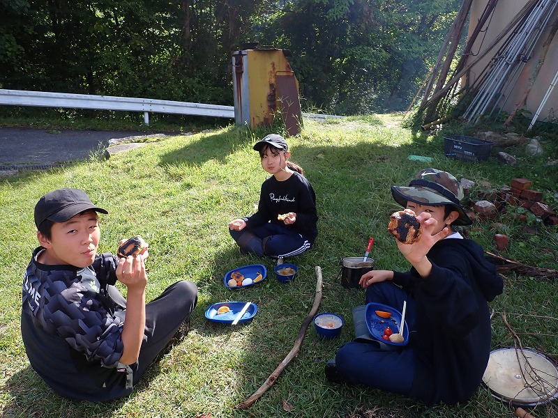 昼食を食べ終えた班から、飯盒や皿を洗ったり、かまどを片付けたり、残った薪を元の場所に返しに行ったりして、13時40分ごろには、キャンプ終了。最後に閉会式をし、集合写真を撮ってから解散しました。今回は、珍しく2日間とも晴れ、乾いた薪が多かったことと、班員で協力してたくさんの薪を集められたことが要因で、どの班も三食とも大きなトラブルもなく作れました。野外炊事班のテーマ“同学年で協力してみよう”通り、同じ学年(同じ班)で協力できたことだけでなく、今回はほとんどの子が楽しそうに野外炊事をしていたように見えました。「めちゃめちゃ楽しかったからまたキャンプやりたい!」と言う子もいました。次回はどんなキャンプになるかな~。