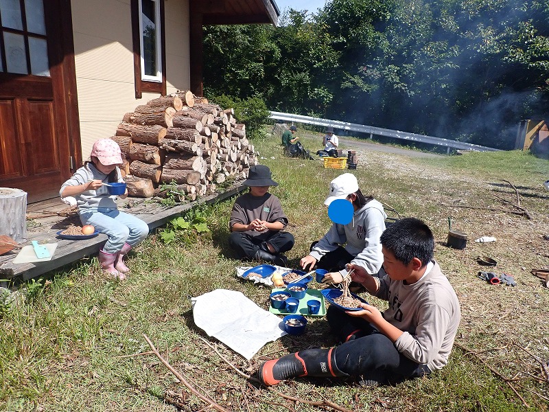 朝食作りの時の火がまだ残っていた班がほとんどだったので、昼食作りも楽々(?)成功。火おこしや火の管理は出来たけれど、乾麺そばのゆで方(湯がき方や湯がいた後ぬめりを取る方法など)が分からない子がほとんどでした。