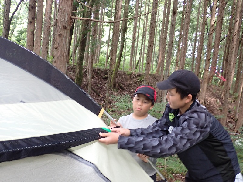 学園生は、3回目(継続生はもっと)のテント張りですが、「このポールってここだよね?」「これで合ってる?」などと指導員に確認したり、間違ったところにポールを通していたり、テントを入れていた袋をそのまま外に放置していたり(なくさないようにテントの中に入れておく決まりとなっています。)と、まだテント設営は完ぺきではないようでした。