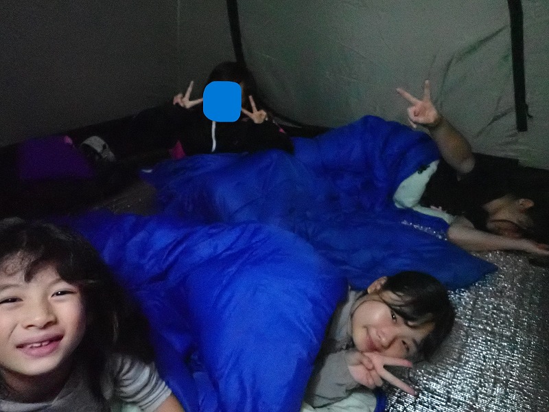 20時半頃にはテントに入り、21時には消灯しました。翌日の起床時間の6時半までは、テントの中で騒がないルールでしたが、テントや寝袋で寝て興奮しているからか、周りの自然の音が気になってしまうのか、朝方に騒ぎ始めた子がいました。また、夜中や朝方はとても寒かったこともあり、うるさかったり寒かったりで快眠は出来なかったと話す子たちもいました。