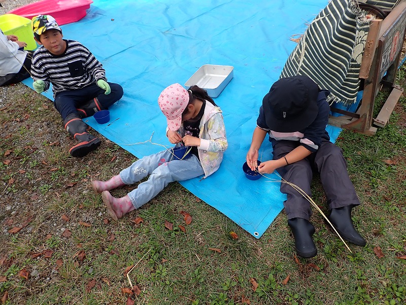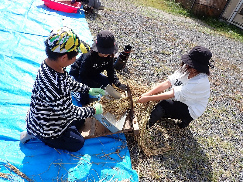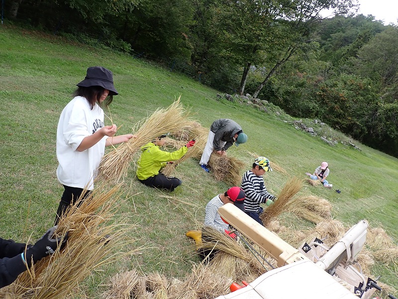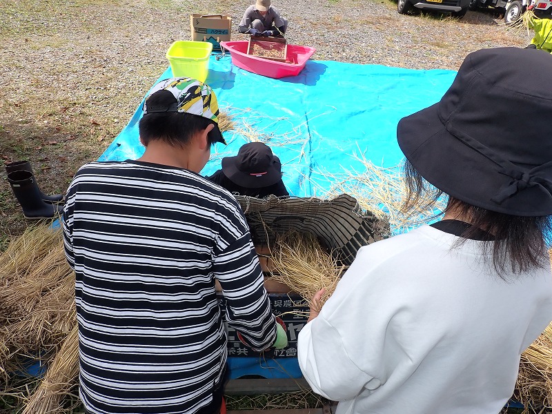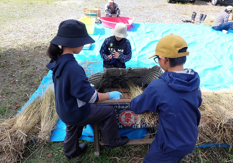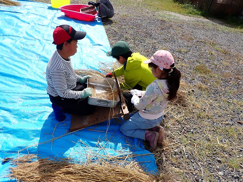 9月15日にみんなで稲刈りをし、約1か月間はざかけしておいた「シナノモチ」の脱穀をしました。