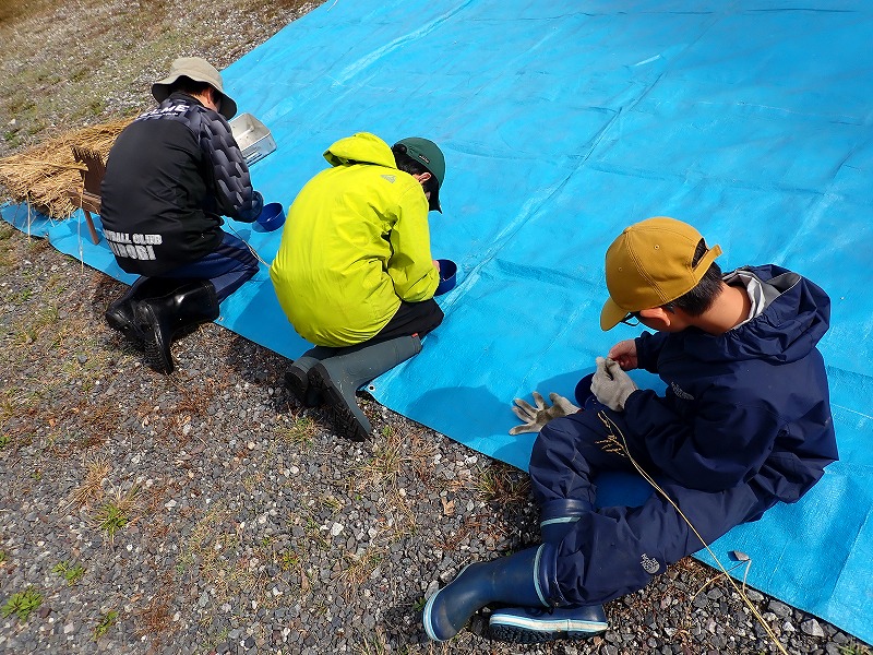 ハーベスターも完ぺきではないので稲束を一つ一つこき残しがないかみんなでチェックしました。