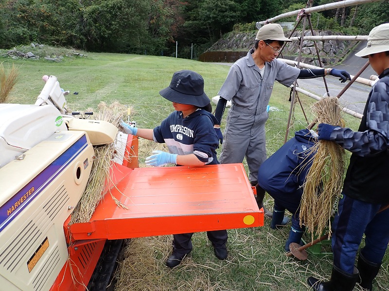 ハーベスターは脱穀、ふるい、風選の作業を一度にやってくれる素晴らしい機械です。午前中に脱穀した3倍の量の稲束を35分ほどで脱穀・選別してしまいました。あまりのスピードに子どもたちは驚き、「最初から全部ハーベスターでやればいいのに」と体験のためにやっていることを忘れて、元も子もないことを言っていました。