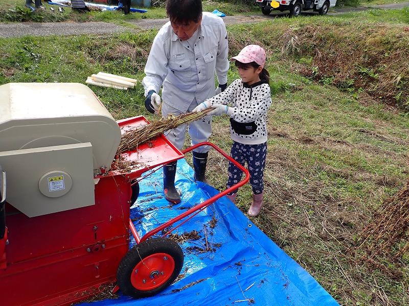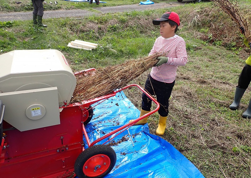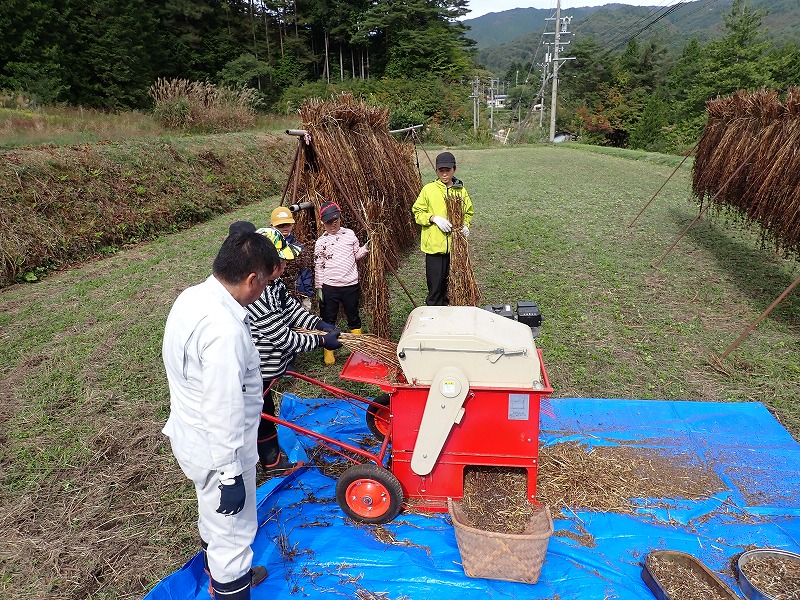 9月23日に刈り取り、はざかけしておいたそばの脱穀を行いました。10月に入り、晴れの日と雨の日が交互にあったため前日に脱穀した稲と同様、若干湿気ていましたが脱穀を決行しました。