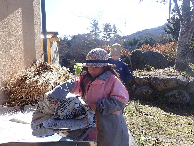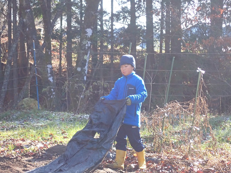 マルチを剥がして小さくたたんだり、土を均したり、また、ビニールハウスのビニールを剥がしたりしました。土を均すのは、継続生のAoさん以外は少々苦戦・・・。上手く鍬を使えず、いくらやっても表面が凸凹していました。また、Aoさんや指導員が綺麗に均した所に足を踏み入れ、「せっかく均したから足跡つけないで」と、注意されていた子たちもいました。しかし、見様見真似で作業し、徐々に綺麗に均せるようになっていました。
