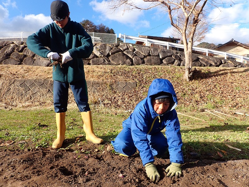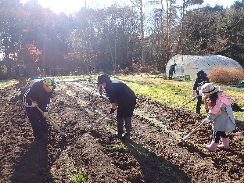 29日の午前中は、休日部活に参加しに行った中学生3人以外の6人で、畑の片付け。来年度もたくさんの作物を収穫できるようにと、冬の間は寒さを利用して土づくりをします。そのため、畑一面を一度軽く耕し、平らにしておきます。