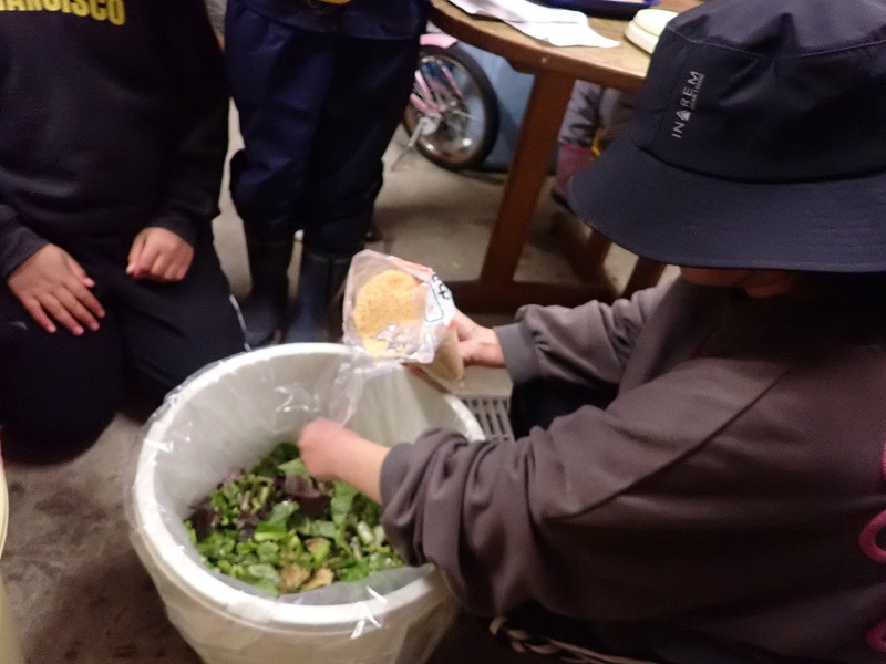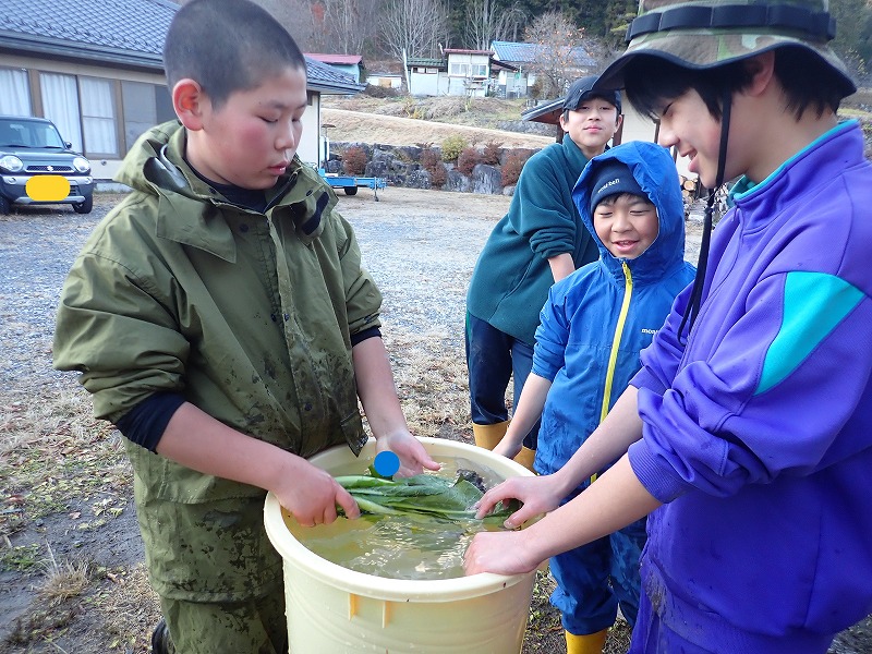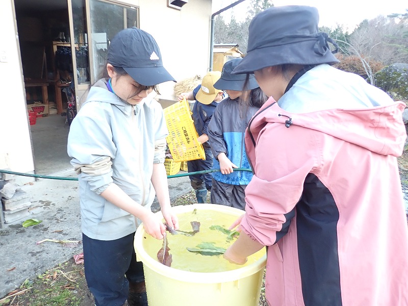 「手が動かなくなってきたー」「冷たいー!」と言いながらも一生懸命作業する子たち、冷たさを紛らわすために雑談をする子たち、黙々と作業する子たち、しっかりチェックせずに次の槽へかぶ菜を回そうとする子たちなど、様々でした。きちんと作業している女の子たちは、さぼってばかりいる子たちにイライラ。「ちゃんとやって!」「(作業が)終わらないじゃん!」と、注意の声が飛ぶ時もありました。