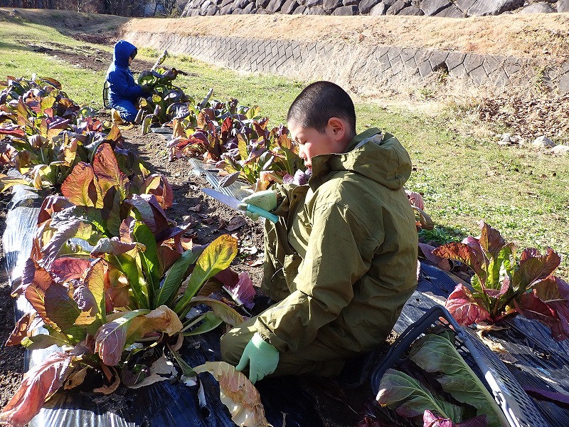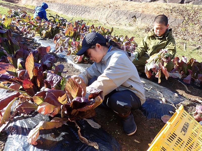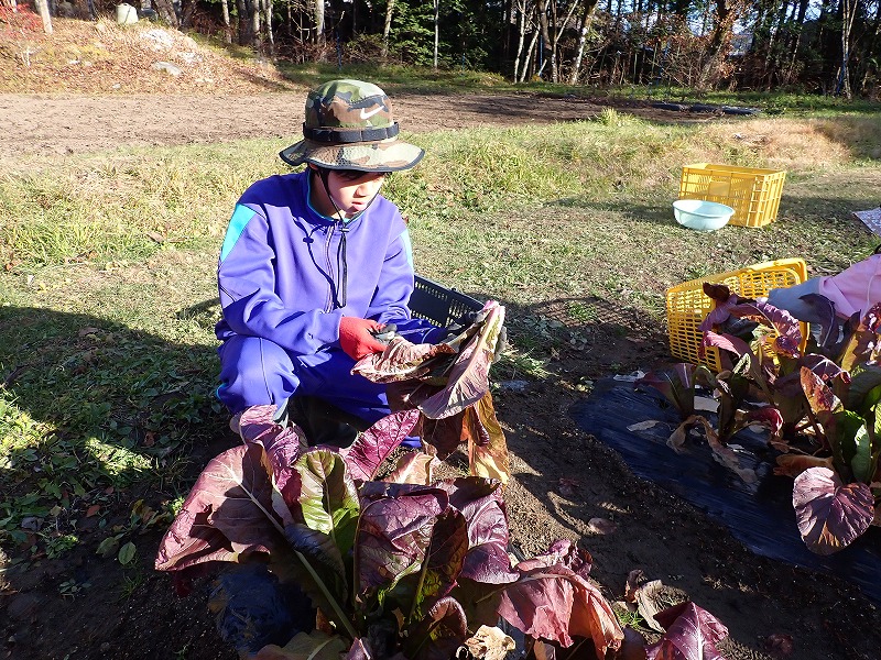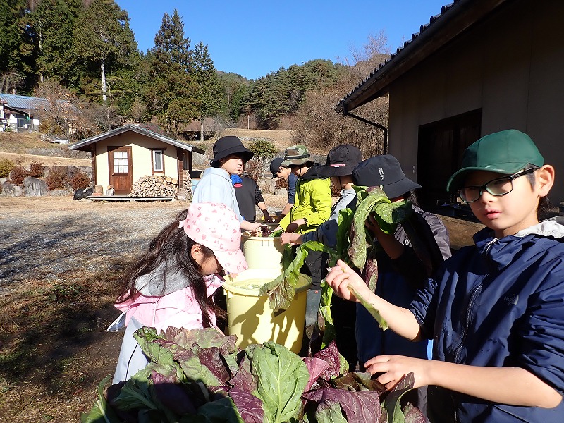 29日の午後からは、全員で源助かぶ菜の収穫をしました。源助かぶ菜は、飯田・下伊那地方の伝統野菜に認定されている漬け菜の一つです。この辺りには長く厳しい冬の間の重要な保存食として、かぶ菜を漬け物にして、春まで少しずつ食べるという食文化が残っています。