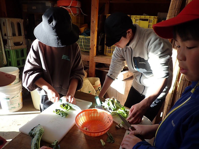 午後からは、体験留学生と一緒に、かぶ菜を切り漬けにしたり、干しかぶにするためにかぶを切ったりする作業をしました。かぶ菜は、包丁で2~3cm幅にカットしました。女の子たちは、最初から最後まで2~3cm幅でカットできているように見えましたが、男の子たちは、段々幅が広がっていく子たちがほとんど。「大きすぎない?」と、時々指導員らに指摘されていました。