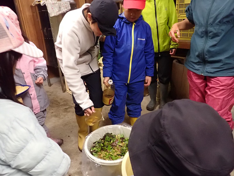 最後に、樽に漬け込む作業。切ったかぶ菜と調味料(醤油・ザラメ・酢)を混ぜ合わせ、重石をし、倉庫に保管することにしました。