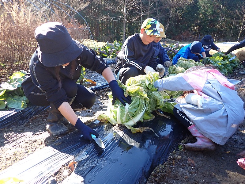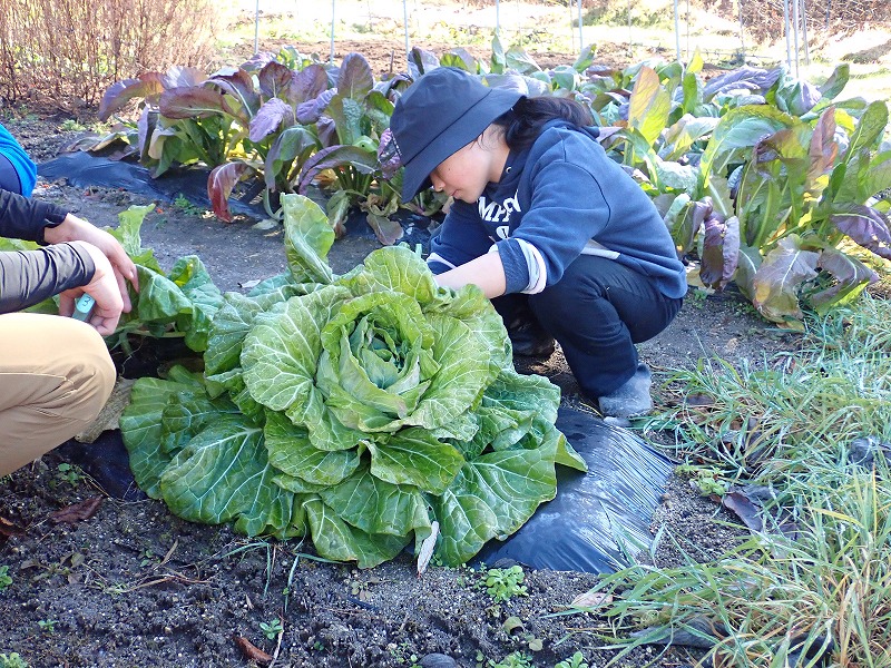 外葉を取ると少しスリムになるので、「だいぶ小さくなっちゃったー」と言ったり、「うちの子かわいいでしょ!」と、自分で収穫し、整えた白菜やキャベツを愛でたりしている子たちがいました。
