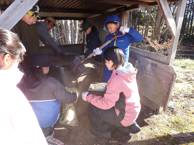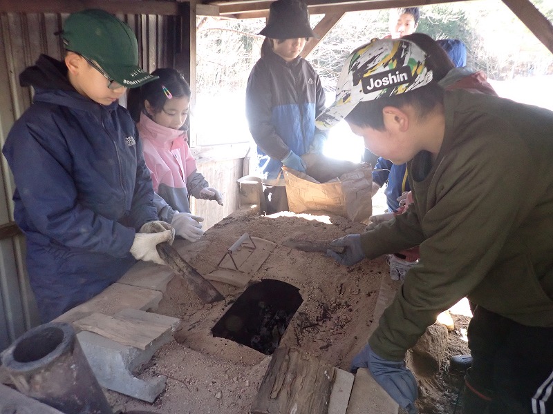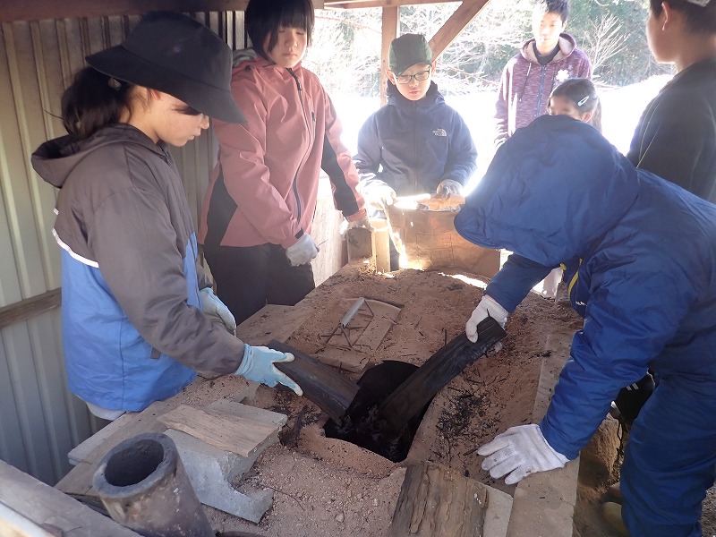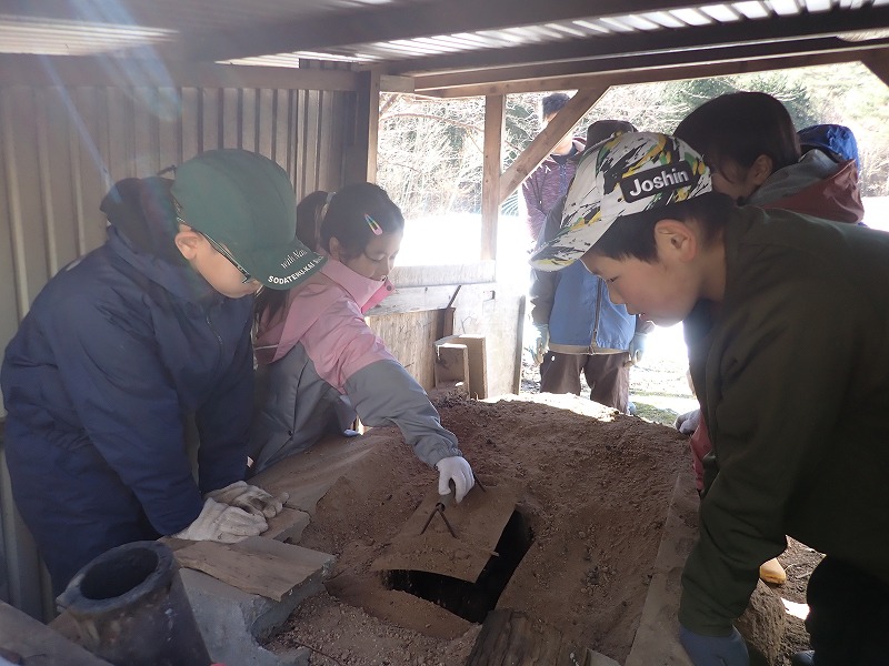 そして、代表してSさんが窯のフタをオープン!窯の中を覗いてみると・・・「おー」「炭だ!」「すげー」と声が上がりました。