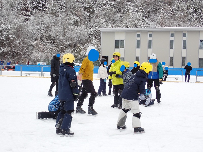 村の小学生は、毎冬学校の田んぼスケートリンクでスケートをしているので、上手に滑る子がたくさんいます。学園生が、村の中学生にアドバイスをもらう様子も見られました。