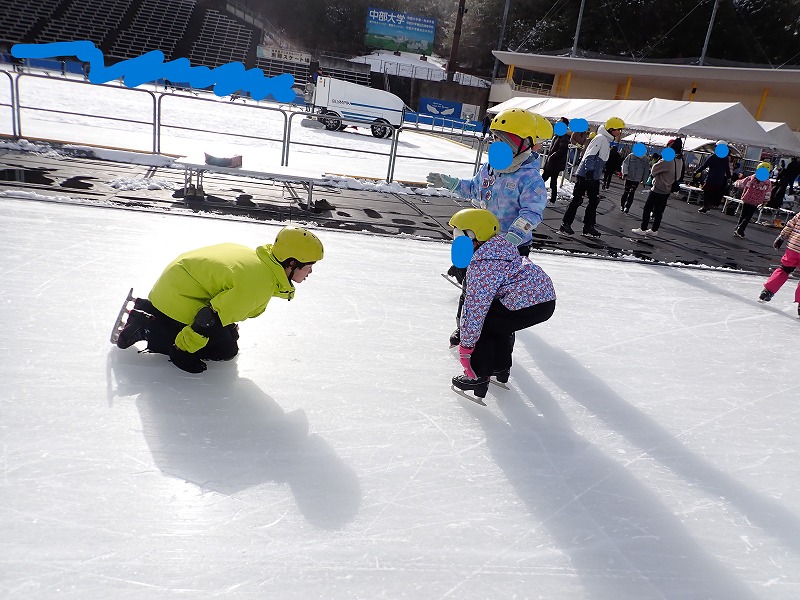 そして、1時間程の昼休憩を挟み、13時過ぎからスケートを再開しました。 午前中に引き続き、遊びながら滑ったり、競走したり、また、整氷車が入って盤面がつるつるになったので、わざと転んでスライディングを楽しんだりしていました。